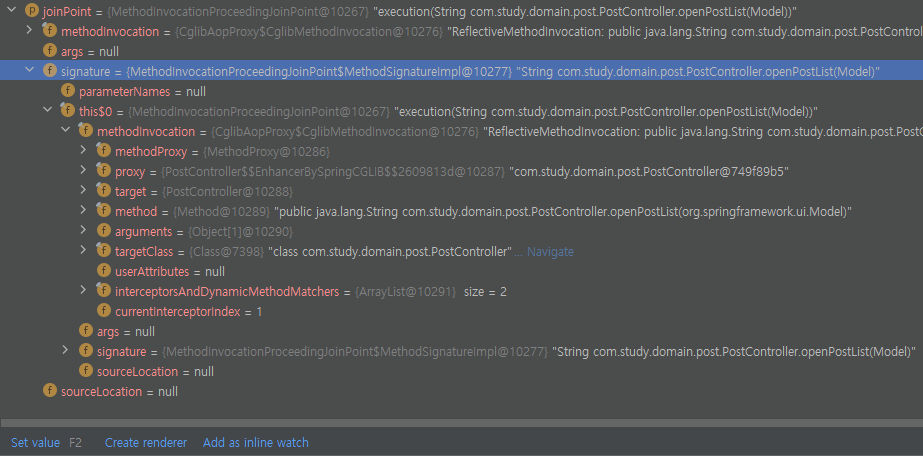 다음은 ProceedingJoinPoint 타입의 객체인 joinPoint입니다. joinPoint 객체 안의 signature 객체는 클래스와 메서드에 대한 정보를 담고 있는 객체로, 다음과 같은 구조를 가집니다.