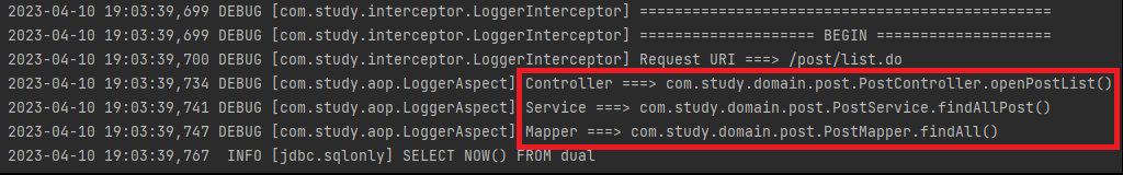 게시글 리스트로 접근해 보면, IDE 콘솔에 LoggerAspect에 작성한 로직대로 로그가 출력됩니다. 사실, 인터셉터만으로도 백엔드 영역을 추적할 수 있긴 하지만, AOP 설정을 통해 어떤 클래스의 어떤 메서드가 실행되었는지 한눈에 확인할 수 있게 되었습니다.