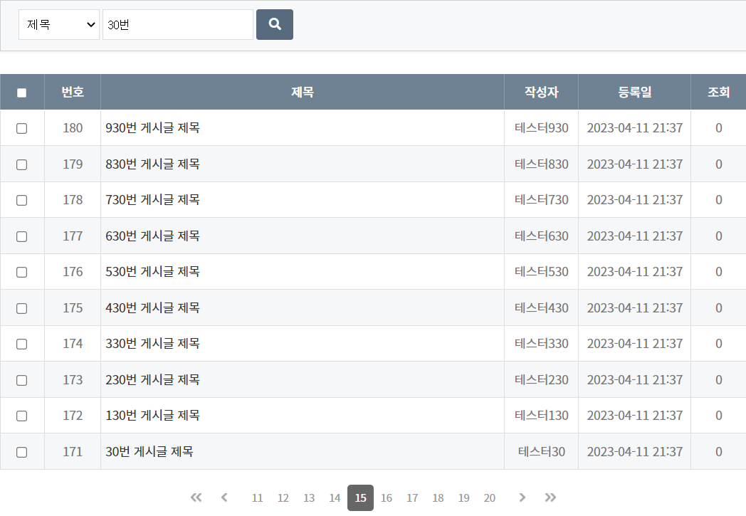 먼저, 제목으로 "30번"을 검색한 후 15페이지로 이동한 결과입니다.