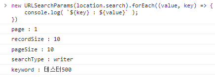 이제, 리스트 페이지에서 검색 유형과 키워드를 세팅하고 검색해 보면, searchType과 keyword가 파라미터로 함께 전송됩니다.