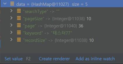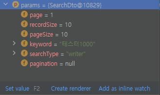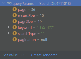 다음은 deletePost( )에 추가로 선언한 SearchDto 타입의 객체인 queryParams로 넘어온 파라미터 구조입니다.