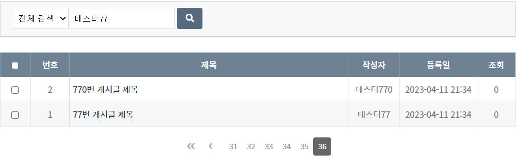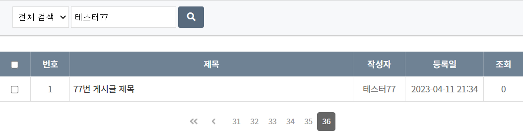 다음은 전체 검색으로 "테스터77"을 검색한 후 마지막(36) 페이지로 이동한 결과입니다.
